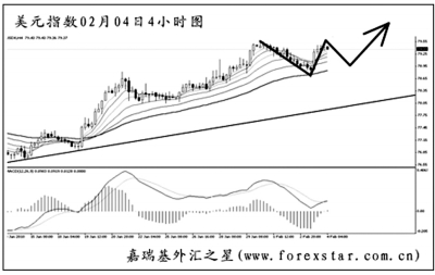 投資人矚目的美聯(lián)儲議息會議以預(yù)期中的維持利率不變結(jié)束,但會后聲明表達了對經(jīng)濟前景更加樂觀的看法,而且在利率決定投票過程中,堪薩斯聯(lián)儲主席霍恩發(fā)出了反對將利率維持在近零水平的呼聲,這使得市場進一步預(yù)期美國或許離加息越來越近,由此引發(fā)的買盤刺激美元全線大幅上揚,美元指數(shù)以一波日線四連陽的強勢突破前期高點,觸及半年以來的新高,周線也實現(xiàn)兩連陽。而中國逐步收緊貨幣政策、投資者對歐元區(qū)成員國財政問題的擔憂以及美國強勁GDP數(shù)據(jù)等因素也在美元的上攻過程中發(fā)揮了不可磨滅的作用。 美聯(lián)儲公開市場委員會的投票情況,以及聯(lián)儲對經(jīng)濟前景更加樂觀的看法,也為未來幾周美元的強勢奠定了基調(diào)。歐洲央行、瑞士央行以及其他幾家央行即將停止與美聯(lián)儲的美元互換操作,該消息進一步鞏固了有關(guān)美國經(jīng)濟步入正軌的看法,表明美聯(lián)儲即將踏上緊縮貨幣政策的道路。 美國上周五公布的第四季度GDP數(shù)據(jù)表現(xiàn)強勁,提升了投資者對于美國經(jīng)濟的復(fù)蘇進程將快于其他國家的預(yù)期,從而也為美聯(lián)儲在此前議息會議聲明中透露出的略顯樂觀的觀點提供了注腳,支持美元進一步走高。美國商務(wù)部公布的初步數(shù)據(jù)顯示,2009年第四季度美國經(jīng)濟大幅增長。經(jīng)季節(jié)性因素調(diào)整后,美國去年第四季度GDP年化季率增長5.7%,高于預(yù)期的增長4.6%,而且增幅為六年來的最大。在GDP數(shù)據(jù)之外,美國當日公布的其他經(jīng)濟數(shù)據(jù)也表現(xiàn)搶眼,幫助美元擴大了GDP數(shù)據(jù)公布后的漲幅。其中,美國芝加哥供應(yīng)管理協(xié)會公布,美國1月芝加哥采購經(jīng)理人指數(shù)升至61.5,12月份修正后的數(shù)據(jù)為58.7,12月初值為60。這是該指數(shù)連續(xù)第四個月處于50的榮枯分水嶺上方,而且創(chuàng)下2005年11月以來的新高。此前,市場預(yù)計1月份該指數(shù)為57.2。此外,美國1月密歇根大學(xué)消費者信心指數(shù)終值升至74.4,初值為72.8,12月終值為72.5。此前,市場預(yù)期該指數(shù)1月份終值為73.0。上述經(jīng)濟數(shù)據(jù)表現(xiàn)強勁,市場將其視為美國經(jīng)濟富有彈性的跡象,與此形成對比的是,歐元區(qū)和英國的經(jīng)濟卻顯現(xiàn)出疲軟跡象。這是美元走強的主要原因,預(yù)計未來數(shù)周美元將繼續(xù)走高。 從圖上看,美元指數(shù)沿日線圖的上升通道上行,繼續(xù)向81.45的上方強阻力挺進。圖中美元指數(shù)已經(jīng)完成了一波5浪上漲,目前在進行B浪調(diào)整,后市有再度展開C浪下跌的風險。雖然MACD也發(fā)生了頂背離的信號,但從主客觀趨勢上看,美元指數(shù)仍然為漲勢,應(yīng)繼續(xù)以看多美元為主。