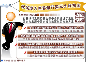 國際貨幣基金組織(IMF)和世界銀行春季會議25日在華盛頓閉幕。會議結(jié)束后,世行行長佐利克感慨地說,這是“多邊主義的美好一天”;IMF總裁卡恩也說,這是世界銀行歷史上“非常重要的一天”。 之所以美好和重要,這是因為在25日的世行發(fā)展委員會上,世行通過了新一輪投票權(quán)改革方案:發(fā)展中國家在世行的投票權(quán)因此增加了3.13個百分點(diǎn),即從44.06%提高到47.19%;中國在世行的投票權(quán)則從2.77%提高到4.42%,僅次于美國和日本。