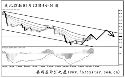 美國(guó)商務(wù)部上周公布的數(shù)據(jù)顯示,美國(guó)5月份國(guó)際商品和服務(wù)貿(mào)易逆差擴(kuò)大4.8%,至422.7億美元,創(chuàng)下2008年11月以來(lái)的最大規(guī)模。而美國(guó)財(cái)政部公布的數(shù)據(jù)顯示,美國(guó)6月預(yù)算赤字為684.2億美元,為連續(xù)第21個(gè)月出現(xiàn)預(yù)算赤字,創(chuàng)延續(xù)時(shí)間之最。國(guó)內(nèi)消費(fèi)方面,美國(guó)6月零售銷售連續(xù)第二個(gè)月下滑,且跌幅超出預(yù)期,表明消費(fèi)支出呈現(xiàn)放緩跡象,并對(duì)受高失業(yè)困擾的經(jīng)濟(jì)形勢(shì)構(gòu)成打擊。美國(guó)6月消費(fèi)者物價(jià)指數(shù)連續(xù)第三個(gè)月下滑,創(chuàng)2008年10-12月以來(lái)的最長(zhǎng)下滑周期,主要是受到能源價(jià)格下跌的拖累。美國(guó)7月中旬消費(fèi)者信心受挫,降至2009年3月以來(lái)的最低水平。市場(chǎng)分析師指出,由于美國(guó)經(jīng)濟(jì)數(shù)據(jù)全線疲軟,投資者信心遭受打擊,并且也引發(fā)了美國(guó)第二季度經(jīng)濟(jì)增長(zhǎng)大幅放緩的憂慮,令美元全線潰敗。 歐洲方面,希臘、葡萄牙、西班牙均成功發(fā)行國(guó)債,暗示歐元區(qū)債市有望逐漸恢復(fù)常態(tài),國(guó)家主權(quán)債務(wù)違約的風(fēng)險(xiǎn)正在下降。分析人士表示,盡管葡萄牙主權(quán)信用評(píng)級(jí)再遭穆迪調(diào)降,但是對(duì)歐元的沖擊已經(jīng)十分有限。隨著希臘、西班牙和葡萄牙等國(guó)國(guó)債的信用違約掉期合約價(jià)格開(kāi)始走低,表明投資者對(duì)這些國(guó)家出現(xiàn)債務(wù)違約風(fēng)險(xiǎn)的擔(dān)憂有所緩解。 從圖上看,美元指數(shù)在4小時(shí)圖通道下沿的位置遭遇支撐小幅反彈,圖中均線系統(tǒng)被穿破。原本美元有形成下跌中繼的欲望,但旗形上沿被發(fā)力升破,美元階段性的筑底基本宣告成功,后市將向通道上沿發(fā)起挑戰(zhàn)。短線美元指數(shù)還將有一波下調(diào),下周將以沖高回落的走勢(shì)為主。 下周需重點(diǎn)關(guān)注的財(cái)經(jīng)數(shù)據(jù)及事件包括:7月23日,德國(guó)公布7月IFO商業(yè)景氣指數(shù)(前值101.8)、英國(guó)公布第二季度GDP初值季率及年率(前值+0.3%、-0.2%);7月26日,日本公布6月商品進(jìn)、出口海關(guān)年率(前值33.4%、32.1%)、美國(guó)公布6月新屋銷售總數(shù)年化(前值30萬(wàn)戶);7月27日,美國(guó)公布7月里奇蒙德聯(lián)儲(chǔ)制造業(yè)指數(shù)(前值+23);7月28日,澳大利亞公布第二季度消費(fèi)者物價(jià)指數(shù)季率及年率(前值+0.9%、+2.9%)、美國(guó)公布6月耐用品訂單月率(前值-0.6%);7月29日,美聯(lián)儲(chǔ)公布褐皮書(shū)、新西蘭聯(lián)儲(chǔ)公布指標(biāo)利率、日本公布6月零售銷售年率(前值+2.8%)、德國(guó)公布7月官方季調(diào)后失業(yè)率(前值7.7%)。