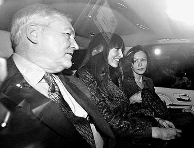 傳媒大亨布萊克因涉嫌巨款牟利出庭受審。這是3月14日在美國芝加哥,康拉德·布萊克在妻子和女兒的陪同下乘車離開法院。