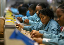 圖為在海信南非發(fā)展有限公司位于約翰內斯堡的工廠,工人電視機生產(chǎn)線上工作。海信公司自1997年底在南非建立第一條生產(chǎn)線,并不斷在南非市場樹立自己的品牌形象。憑借其堅持不懈的品牌戰(zhàn)略,海信在南非的銷量、銷售收入和利潤從98年起以平均每年20%到30%的速度增長。