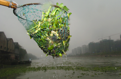 11月29日,河道養(yǎng)護人員正把一袋水葫蘆從運河中撈起。盡管工作人員的奮力打撈,但水葫蘆還是逼近了杭州市中心。近段時間來,由于運河杭州段支線的鄉(xiāng)村河流水質(zhì)富營養(yǎng)化嚴重,導致水葫蘆大面積生長蔓延,加上今年的暖冬天氣,為水葫蘆的生長提供了環(huán)境,加速了水葫蘆的繁殖速度。目前,水葫蘆的瘋長已經(jīng)對運河的行船安全造成了隱患。