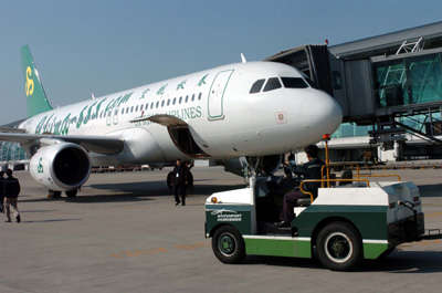 春秋航空公司在11月30日開通的上海-廣州航線上推出低價(jià)機(jī)票。從廣州飛往上海的最低票價(jià)僅為299元,加上150元的機(jī)場建設(shè)費(fèi)和燃油附加費(fèi)后,比廣州到上海的火車軟臥票價(jià)還低。圖為春秋航空公司的空客A320?吭趶V州白云機(jī)場,即將飛往上海。