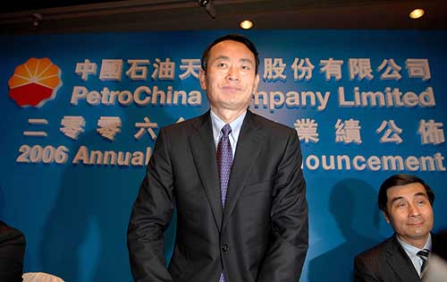 3月19日,中國石油天然氣股份有限公司副董事長及總裁蔣潔敏(中)在新聞發(fā)布會上。當(dāng)日,中國石油天然氣股份有限公司在香港舉行2006年度業(yè)績新聞發(fā)布會,宣布2006年利潤達1422億元人民幣,上升6.6%。