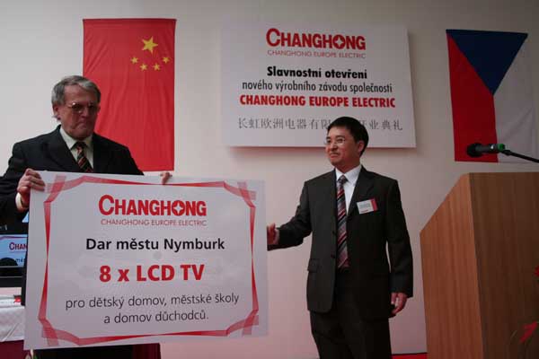 3月28日,長(zhǎng)虹歐洲電器有限公司在捷克中部城市寧布爾克舉行開(kāi)業(yè)儀式,并正式投入生產(chǎn)。這是長(zhǎng)虹在歐洲的最大投資項(xiàng)目,也是中國(guó)家電企業(yè)在歐洲自主投資的第一個(gè)海外生產(chǎn)基地。長(zhǎng)虹捷克生產(chǎn)基地一期項(xiàng)目投資逾1500萬(wàn)美元,總產(chǎn)能100萬(wàn)臺(tái)電視機(jī),主要生產(chǎn)平板電視和高清CRT電視產(chǎn)品。圖為長(zhǎng)虹歐洲電器有限公司總經(jīng)理王文生向?qū)幉紶柨耸惺虚L(zhǎng)Ladislav