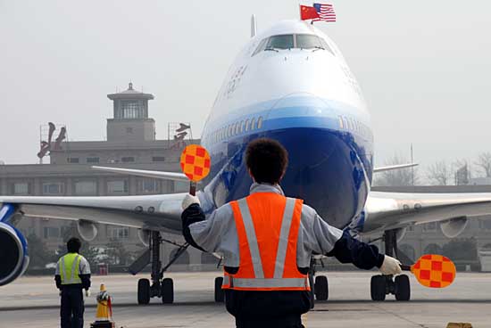3月29日,華盛頓至北京直航班機(jī)在工作人員指揮下入位。當(dāng)日14時(shí)21分,從美國(guó)華盛頓起飛的UA897航班降落在北京首都國(guó)際機(jī)場(chǎng)。至此,由美國(guó)聯(lián)合航空公司乘運(yùn)的華盛頓至北京直航正式開(kāi)通。