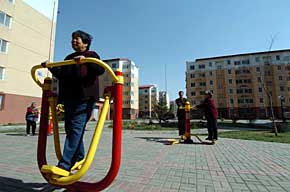 天津市河?xùn)|區(qū)彩麗園廉租房住宅小區(qū)的居民在健身。