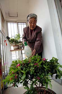 家住天津市河?xùn)|區(qū)彩麗園廉租房的竇紅珍老人在澆花。本報(bào)記者 王曄彪
