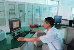 據(jù)統(tǒng)計(jì),2006年云南省紅河州河口口岸對(duì)越輸送電力近4億千瓦時(shí),出口創(chuàng)匯達(dá)1700萬美元,電力已躍居河口口岸出口商品排名前10位。圖為云南省紅河州河口口岸變電站,一名工作人員在主控室操作儀器。