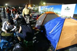 近日,杭州某樓盤(pán)出現(xiàn)多年不見(jiàn)的通宵排隊(duì)買(mǎi)房的景象。許多購(gòu)房者住帳篷、睡草席,連排三天的隊(duì)。圖為5月27日,購(gòu)房者在售樓處外排隊(duì)等待開(kāi)盤(pán)。