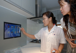 日前,海信集團(tuán)在青島海信研發(fā)中心正式發(fā)布命名為“DNet-home”的數(shù)字家庭系統(tǒng)標(biāo)準(zhǔn)第一版。在參照“DNet-home”標(biāo)準(zhǔn)建造的數(shù)字家庭體驗(yàn)館內(nèi),通過一部可隨身攜帶的平板電腦,業(yè)主就能在房屋內(nèi)的任何一個位置,對家中的電視、空調(diào)、電話、電冰箱、保安系統(tǒng)和智能監(jiān)控系統(tǒng)進(jìn)行設(shè)定和更改,同時(shí)通過移動電話、互聯(lián)網(wǎng)絡(luò)等設(shè)備還可對家中所有電子設(shè)備進(jìn)行遠(yuǎn)程遙控。 圖為研發(fā)人員在演示多媒體廚房控制系統(tǒng)。 |