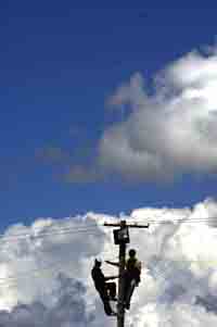 兩名工作人員在維修電線(xiàn)。本報(bào)記者:普布扎西 攝