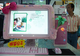 在蘇州市一家數(shù)碼商城,一商家展示的一款電腦,顯示器被套上漂亮“外套”,吸引了不少市民的目光。