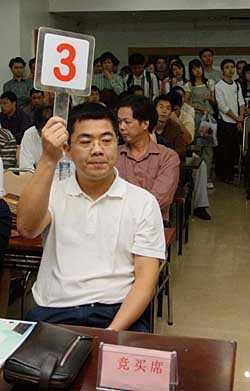 | 日前,福州市公開拍賣出讓11幅地塊。備受關(guān)注的福州個人合作建房組織也在其中,但在本次拍賣會上并沒有舉一次牌。圖為3號代表以5億3400萬拍下34.17畝土地,搶到了當(dāng)場舉牌第一名。新華社記者