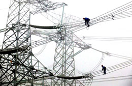 位于重慶市綦江縣的隆盛變電站目前已基本建成,本月底即將投入運行,這標志著重慶提前三年完成了500千伏“日”字形環(huán)網(wǎng)建設,重慶電力供應緊張局面將得到緩解。圖為電業(yè)工人在高空作業(yè)。