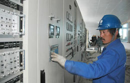 應(yīng)急電源工程是西藏自治區(qū)為緩解冬季電力高峰矛盾興建的重點工程,總投資1.4億多元,計劃2008年6臺機組全部投產(chǎn)發(fā)電。圖為12月9日,工程師在藏中電網(wǎng)應(yīng)急電源主控機房調(diào)試相關(guān)設(shè)備。