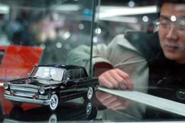 中國長春汽車文化園展銷中心正式“開門迎客”,它是繼汽車博物館之后,中國長春汽車文化園中第二個向社會開放的項目,該中心總建筑面積約5萬平方米,可以同時展賣上千輛商務及家庭用車,規(guī)模在東北地區(qū)首屈一指。圖為一位參觀者在欣賞展銷中心內的紅旗車模型。