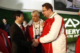 奇瑞汽車董事長尹同耀與海外經(jīng)銷商交談。 | 本報(bào)訊
