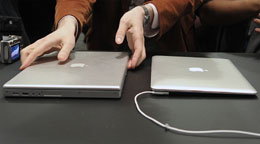 日前,蘋果電腦公司在美國加州舊金山舉行的“蘋果大會”上,推出厚度僅為1.94厘米,重量1.36公斤的MacBook Air筆記本電腦。圖為參觀者正在比較MacBook Air和以前出品的MacBook Pro筆記本電腦。