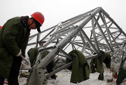 近日,嚴重的雪凝災害造成貴州電網(wǎng)大面積損毀,全省近一半縣市相繼斷電。盡管山高坡陡、搶險艱苦,但貴州1.7萬多名電力職工發(fā)揚“不怕吃苦、不畏嚴寒”的精神,晝夜奮戰(zhàn)在抗災第一線。圖為南方電網(wǎng)公司貴陽供電局的搶險人員正在重建電塔。