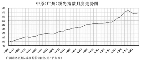 2008年2月,中原(廣州)領先指數(shù)為166.4,環(huán)比下降0.2,降幅僅為0.1%。自去年12月中原領先指數(shù)出現(xiàn)大幅度的下滑,其后三個月價格連續(xù)下跌,但跌幅逐月收窄,到本月止,降幅已經(jīng)由2.7%減少到了0.1%,價格走勢已明顯止住了跌勢,有回歸穩(wěn)定的跡象。