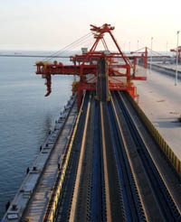 日前,國投曹妃甸煤炭碼頭一期工程基本完工,將于6月份投產(chǎn)。國投曹妃甸煤炭碼頭規(guī)劃建設(shè)5至10萬噸級煤炭泊位16個,年煤炭下水能力2億噸。這是曹妃甸煤炭碼頭安裝完畢的裝船機。 本報記者:楊世堯
