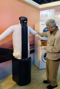 日前在上海舉行的“2008中國家電博覽會”上,國內外廠商紛紛亮出最新的時尚家電產品。其中,液晶顯示屏在廚房家電上的普遍采用使家務勞動更具趣味性;同時,更人性化的時尚設計使家電產品讓家務勞動更“省力”。圖為展會展出的全自動熨衣機。