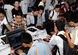 日前,第四屆中國(guó)國(guó)際動(dòng)漫產(chǎn)業(yè)博覽會(huì)在杭州開幕。在看似簡(jiǎn)單的電子游戲、動(dòng)畫片等動(dòng)漫產(chǎn)業(yè)終端產(chǎn)品的背后,是一整條包括科技研發(fā)、制作、銷售和動(dòng)漫形象衍生產(chǎn)品開發(fā)的產(chǎn)業(yè)鏈,據(jù)估計(jì),中國(guó)動(dòng)漫游戲產(chǎn)業(yè)年總產(chǎn)值在180億元左右。圖為一些學(xué)生圍聚在電腦前嘗試新的電腦游戲。 |