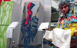 日前,中外藝術(shù)家創(chuàng)作的28臺(tái)彩繪冰箱亮相北京。這些彩繪冰箱拍賣(mài)后所得的善款將捐給中國(guó)扶貧基金會(huì)“母嬰平安120行動(dòng)”。圖為京劇演員展示彩繪冰箱。