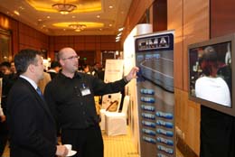 日前,2008亞太未來電視國際峰會在上海舉行,來自世界各地200多位電信運(yùn)營商、傳媒集團(tuán)、廣電設(shè)備提供商等機(jī)構(gòu)參加了會議。為期兩天的會議圍繞數(shù)字技術(shù)下的電視業(yè)發(fā)展、未來電視的商業(yè)模式創(chuàng)新、新技術(shù)下的電視創(chuàng)新與融合等專業(yè)內(nèi)容進(jìn)行主題演講與討論。圖為英國一家數(shù)字廣播公司代表(左二)在介紹情況。