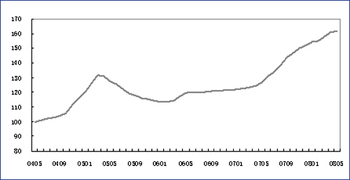 2008年5月,中原(上海)領(lǐng)先指數(shù)為162點(diǎn),樣本成交均價(jià)為18437元/平方米,環(huán)比上漲0.63個(gè)百分點(diǎn),在成交價(jià)格保持高位的同時(shí),5月二手房成交量卻有所回落,根據(jù)中原統(tǒng)計(jì)數(shù)據(jù)顯示,本月成交量較上月減少了20%左右?傮w來(lái)說(shuō),5月上海二手房市場(chǎng)呈現(xiàn)價(jià)穩(wěn)量跌的態(tài)勢(shì)。