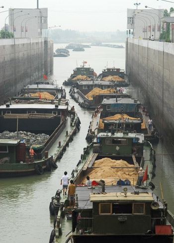 7月1日,裝載貨物的船隊(duì)通過(guò)臺(tái)兒莊船閘。受近期油價(jià)上漲因素的影響,水上運(yùn)輸以其運(yùn)量大、運(yùn)費(fèi)低、環(huán)保節(jié)能等多方面優(yōu)勢(shì)成為運(yùn)河沿線眾多企業(yè)大宗貨物首選運(yùn)輸方式,使京杭運(yùn)河山東臺(tái)兒莊段更加繁忙。