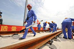 7月1日,中鐵十一局施工人員在武(漢)廣(州)客運(yùn)專線咸寧試驗(yàn)段鋪設(shè)鐵軌。武廣客運(yùn)專線主要應(yīng)用了板式和雙塊式無砟軌道,具有技術(shù)新、標(biāo)準(zhǔn)高、工程龐大、系統(tǒng)復(fù)雜等特點(diǎn),對于推進(jìn)我國客運(yùn)專線健康發(fā)展將是至關(guān)重要的一個環(huán)節(jié)。武廣客運(yùn)專線將于9月1日進(jìn)行每小時385公里高速列車試驗(yàn),以滿足每小時350公里的開通速度。于2005年開工的武廣客運(yùn)專線,將于2010年全線貫通,武廣客專建成后,從武漢到廣州乘火車僅需4個小時。 |