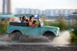 7月12日,在俄羅斯首都莫斯科前圖希諾機(jī)場(chǎng)(Airport Tushino),人們開著吉普車從水中駛過。當(dāng)日,2008汽車風(fēng)情展(Autoexotic 2008)莫斯科站正式對(duì)公眾開放,汽車愛好者們開著自己的愛車聚集在這里,交流車技和改裝、保養(yǎng)車輛的知識(shí),分享對(duì)汽車和駕駛的熱愛之情,觀看表演品嘗美食,享受夏日時(shí)光。