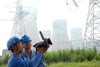 安徽淮南供電職工利用紅外線測溫儀對大唐洛河發(fā)電廠輸往華東電網(wǎng)線路進(jìn)行監(jiān)測,確保電網(wǎng)安全運(yùn)行。新華社發(fā)(陳彬