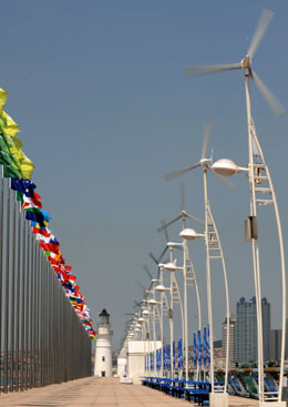 青島奧帆中心在場(chǎng)館建設(shè)中倡導(dǎo)“科技奧運(yùn)、綠色奧運(yùn)”的理念,大量利用太陽(yáng)能、風(fēng)能等清潔能源。圖為奧帆中心主防波堤建設(shè)安裝了41盞風(fēng)能燈。新華社記者:宋振平