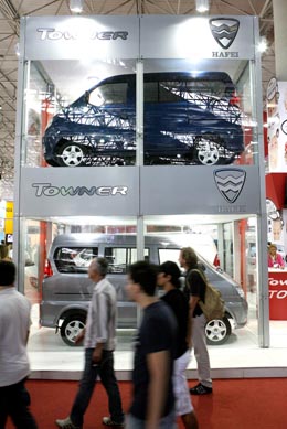 圖為參觀者經(jīng)過哈飛汽車展臺。