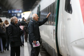 盡管在瑞士蘇黎世州每千人擁有私人汽車超過800輛,但是仍然有60%的居民在高峰時段選擇公共交通工具出行。由49家公交運營公司組成的蘇黎世公共交通網(wǎng)絡(luò)提供鐵路、公共汽車、有軌電車、無軌電車、湖船等服務(wù),其中軌道交通通車里程約為600公里。乘客一票在手可以在所購車票規(guī)定時間內(nèi)不限次數(shù)乘坐任意公共交通工具。圖為在蘇黎世的中央車站,兩位老人與親友道別。