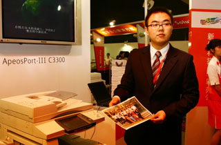 日前,富士施樂在上海推出首次采用環(huán)保概念的產(chǎn)品系列。據(jù)悉,該系列產(chǎn)品采用全新LED技術(shù),并率先應(yīng)用以無(wú)鉛軸制造的送紙器:部分部件中使用以玉米為主的生化塑料減少了碳排放量;利用節(jié)能控制器技術(shù)使機(jī)器在睡眠模式下只有2.2W的每小時(shí)耗電量。此外,新產(chǎn)品在網(wǎng)絡(luò)傳輸和終端輸出的安全性能上也有了大幅度的提升。圖為技術(shù)人員在現(xiàn)場(chǎng)演示新產(chǎn)品的功能。 |