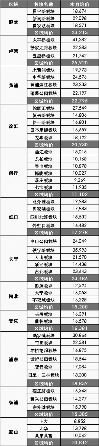 上海市各區(qū)域、板塊均價(單位:元/平方米)