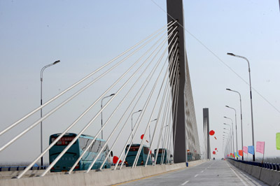11月26日,我國首座四塔單索斜拉橋山東濟(jì)陽黃河公路大橋建成通車。大橋總投資4.2億元,全長1165米,主橋最大跨度216米。大橋建成后,成為溝通京滬高速、青銀高速等多條國家公路主干線的重要樞紐性工程。