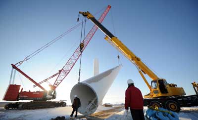 項目總投資4億元的金風(fēng)科技布爾津風(fēng)電場風(fēng)機安裝工作近日啟動。首批近30臺風(fēng)機將于12月中旬安裝完成,實現(xiàn)并網(wǎng)發(fā)電。該發(fā)電場的建設(shè),對于改善阿勒泰地區(qū)的電源組成,優(yōu)化電網(wǎng)結(jié)構(gòu),促進當(dāng)?shù)氐慕?jīng)濟社會的發(fā)展將發(fā)揮積極作用。圖為建設(shè)中的新疆阿勒泰地區(qū)金風(fēng)科技布爾津風(fēng)電場正在緊張安裝。 |