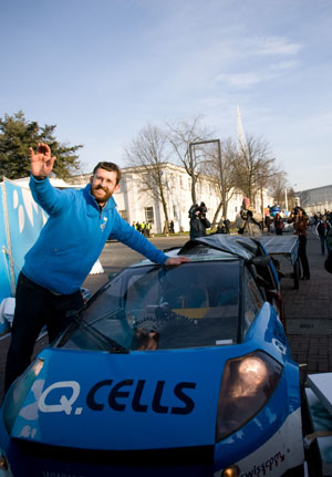 TAXI)抵達(dá)波蘭波茲南聯(lián)合國(guó)氣候變化大會(huì)會(huì)場(chǎng)。 “太陽(yáng)能的士”是人類歷史上第一個(gè)以太陽(yáng)能為動(dòng)力環(huán)游世界的交通工具。帕爾馬自2007年7月3日從瑞士盧塞恩啟程后,迄今已行駛5.2萬公里,途徑38個(gè)國(guó)家和地區(qū)。 因?yàn)榕翣栺R在旅途中總是以自己的太陽(yáng)能汽車搭乘一名路人,所以被稱為“太陽(yáng)能的士”。 |