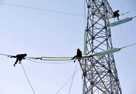為保證京滬高速鐵路滁州段的正常建設(shè)和用電安全,安徽滁州市供電公司500多名電力職工放棄假日休息,加緊進(jìn)行高低壓線路遷改工作。圖為電力職工在滁州市定遠(yuǎn)縣境內(nèi)遷改220千伏供電線路。