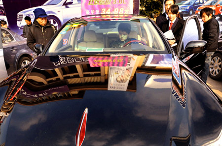 1月2日,杭州市民在觀看一位試車者體驗紅旗轎車性能。當日,杭州舉行“2009汽車超市迎新年”車展,汽車經(jīng)銷企業(yè)展示了紅旗、吉利、長城、奧迪和玲木等熱銷家用轎車,吸引了許多杭州市民前往參觀選購。