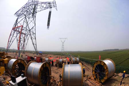 2008年5月10日,在河南省孟州市黃河北岸,施工人員在黃河大跨越工程工地布線。黃河大跨越工程是我國(guó)第一條百萬(wàn)伏級(jí)輸電線路——晉東南—南陽(yáng)—荊門(mén)特高壓交流試驗(yàn)示范工程的關(guān)鍵組成部分,位于河南省孟州市和鞏義市交界處。新華社發(fā)(楊帆