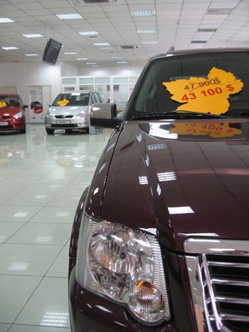 2008年哈薩克斯坦進口新車銷量比2007年暴跌30%,各大代理商紛紛降價銷售庫存車輛。 圖為1月21日,哈薩克斯坦第二大進口汽車官方代理商“M-Auto”的銷售展廳內,福特EXPLORER越野車降價銷售。