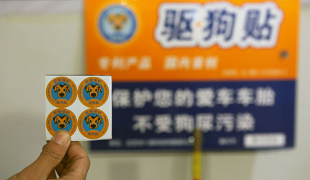 工作人員展示一種可防止寵物狗往車輪撒尿的“驅(qū)狗貼”