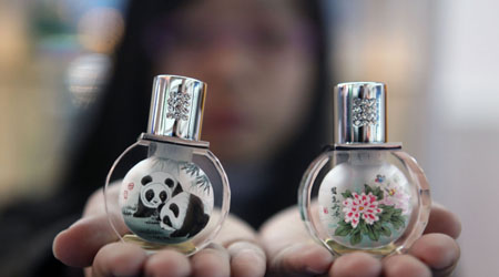 工作人員展示一款鼻煙壺形狀的汽車芳香瓶。