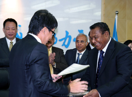 中國(guó)民營(yíng)企業(yè)何佳正元(北京)投資有限公司與印度尼西亞馬魯古省政府日前在北京簽署一項(xiàng)合作協(xié)議備忘錄,雙方將在電站電網(wǎng)建設(shè)和資源開發(fā)等方面進(jìn)行全面合作。根據(jù)備忘錄,何佳正元(北京)投資有限公司將投資10多億元人民幣在印尼馬魯古省進(jìn)行電站電網(wǎng)等項(xiàng)目建設(shè)與資源開發(fā)。圖為簽約現(xiàn)場(chǎng)。
